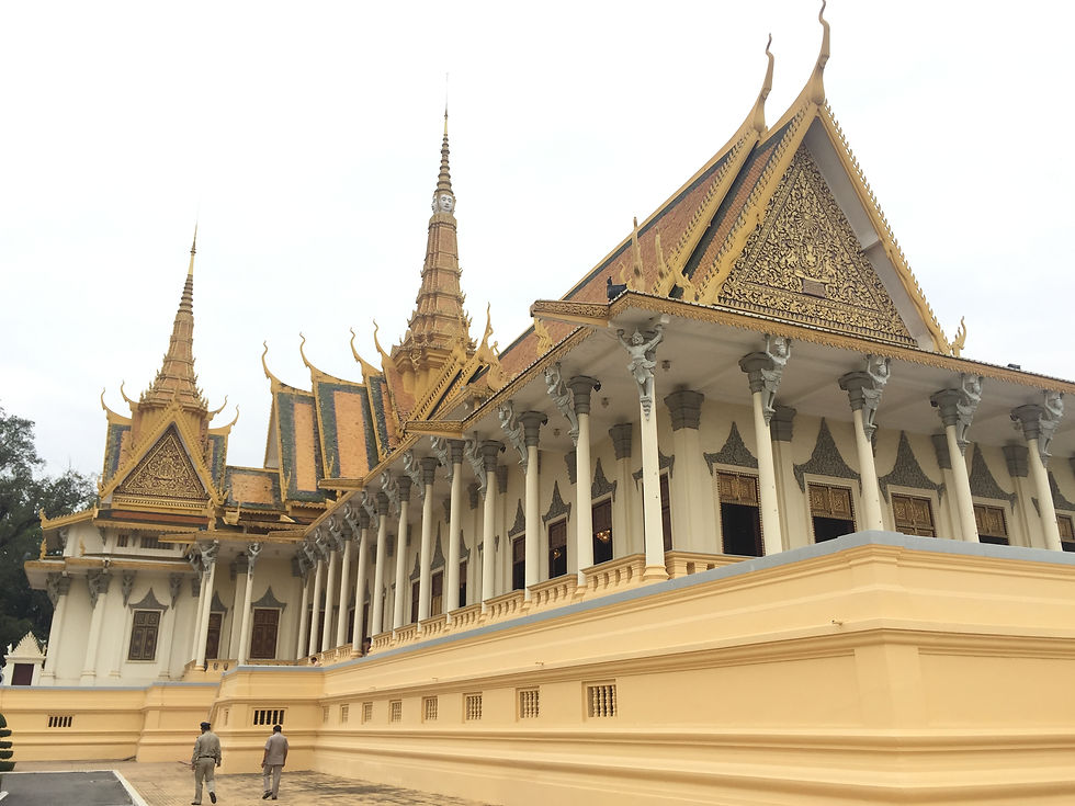 Nous visitons donc le Palais Royal et la Pagode d'Argent. C'est la résidence du roi ; lors de notre visite le drapeau bleu était levé, ce qui signifie que le roi était présent ! Un chauffeur de tuk tuk est venu à notre rencontre en nous disant que le Palais était fermé ce jour mais qu'il pouvait nous emmener visiter la ville. Allez Ben Hur arrête ton char ! À d'autres :) je commence à être rodée aux tentatives d'arnaque...nous partons donc visiter le Palais Royal qui a été construit au début du 20eme siècle par des architectes français et cambodgiens.