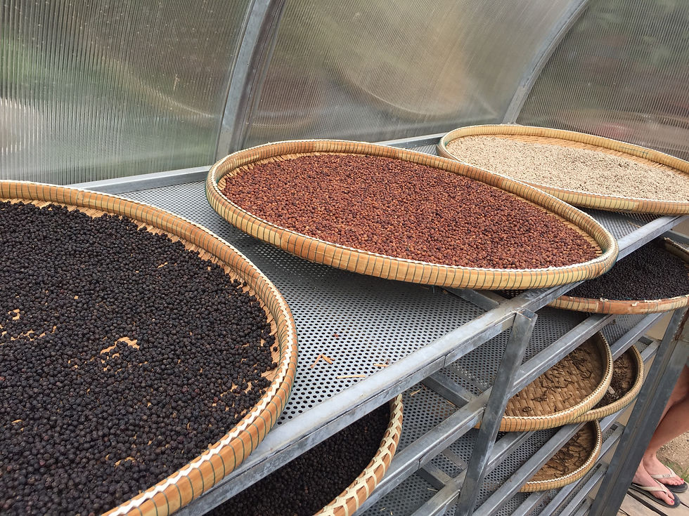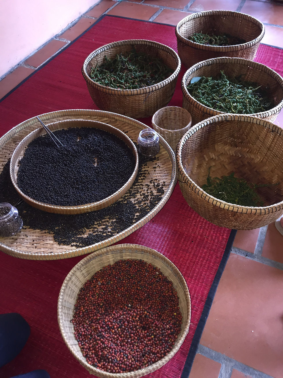 Le poivre de Kampot est considéré parmi un des meilleurs du monde. Le climat, la terre en font un poivre exceptionnel et au goût jamais vu ailleurs ! Les khmers rouges ont détruit toutes les plantations et elles redémarrent doucement, depuis 15 ans. On a donc visité la plantation, en français, et vu le travail de fourmi que c'était de ramasser le poivre et le trier, à la main ! Le poivre est ramassé vert et rouge, puis trié ; le vert sera consommé frais, avec une durée de conservation limitée à quelques jours, ou séché au soleil pour devenir noir. Les grains rouges seront séchés également, une dizaine de jours au soleil. Une partie sera bouillie pour retirer la petite peau rouge et ainsi devenir du poivre blanc !