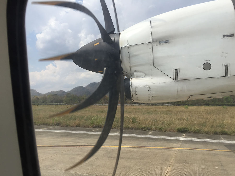 C'est par avion que nous rejoindrons la Thailande. J'ai pendant longtemps eu la phobie de l'avion, celle qui te tord le ventre 3 jours avant le vol, qui te rend muet pendant tout le vol. Je n'osais même pas me lever dans l'avion, de peur de le faire pencher (oui je sais, c'est débile, mais la peur c'est pas rationnel !), et ne parlons pas des turbulences qui faisaient monter ma tension à 22. Je ne sais pas ce qu'il s'est passé pour que cette peur s'efface, mais elle est légèrement réapparue quand j'ai vu le petit avion à hélices que nous allions prendre !