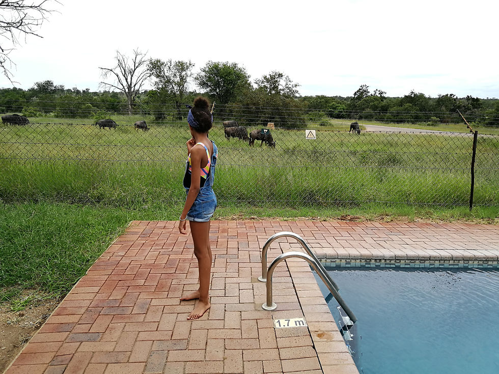Comme j'ai fêté mes 32 ans ici, je me suis offert un petit cadeau : une nuit dans un lodge dans la réserve de Marloth, à quelques kilomètres du parc Kruger. Ici rien n'est fermé car il n'y a pas d'animaux sauvages...en theorie. Contrairement au Kruger que l'on ne peut faire qu'en voiture, ici il est tout à fait possible de se promener à pied. Moi qui ai l'habitude des ambiances backpacker, j'ai été très heureuse que l'on s'occupe un peu de moi. Pour la première fois j'avais une chambre pour moi toute seule et les enfants en partageaient une autre. Pour une fois on m'a servi un jus d'orange en arrivant en me demandant si tout allait bien. Pour une fois on m'a servi à table. Rien a faire, juste du repos autour de la piscine et des petites marches autour du lodge. En fait, pas besoin de marcher. Alors qu'on se baignait, on est venu me prévenir qu'il y avait une girafe devant l'entrée. A peine le temps d'enfiler une serviette que j'assiste à un spectacle de toute beauté : une vingtaine de girafes en balade au milieu du lodge. Un immense mâle très foncé et plein de jolies femelles. Et quelques bébés girafons tout petits ! Très curieuses, on a passé de longs moments à se regarder. J'étais tout prêt d'elles et j'arrivais a peine a leurs genoux ! Le matin de mes 32 ans, j'ai été réveillée très tôt, et malgré un lit ultra confortable je me suis promenée un peu. Le matin l'ambiance est vraiment spéciale ! Je suis tombé nez à nez avec une girafe et son petit. Puis, en rentrant, 5 zèbres sont venus me saluer. J'étais impressionnée et pas rassurée car ça reste des animaux sauvages ! Mais je fonds devant ces petits chevaux rayés. Ils se sont rapprochés tout prêt et m'ont léché la main. Le temps était carrément suspendu, je n'ai même pas de mot tellement c'était un moment incroyablement fort, qui n'appartient qu'à moi, dans ce petit matin où il n'était pas encore 6h30 et où personne n'était encore debout. Le ranger du lodge est arrivé et il m'a dit qu'on avait eu une chance incroyable : les girafes, puis les zèbres, l'autruche et enfin la famille phacochère. Ils sont tous venus nous voir, dans l'immensité du parc.
